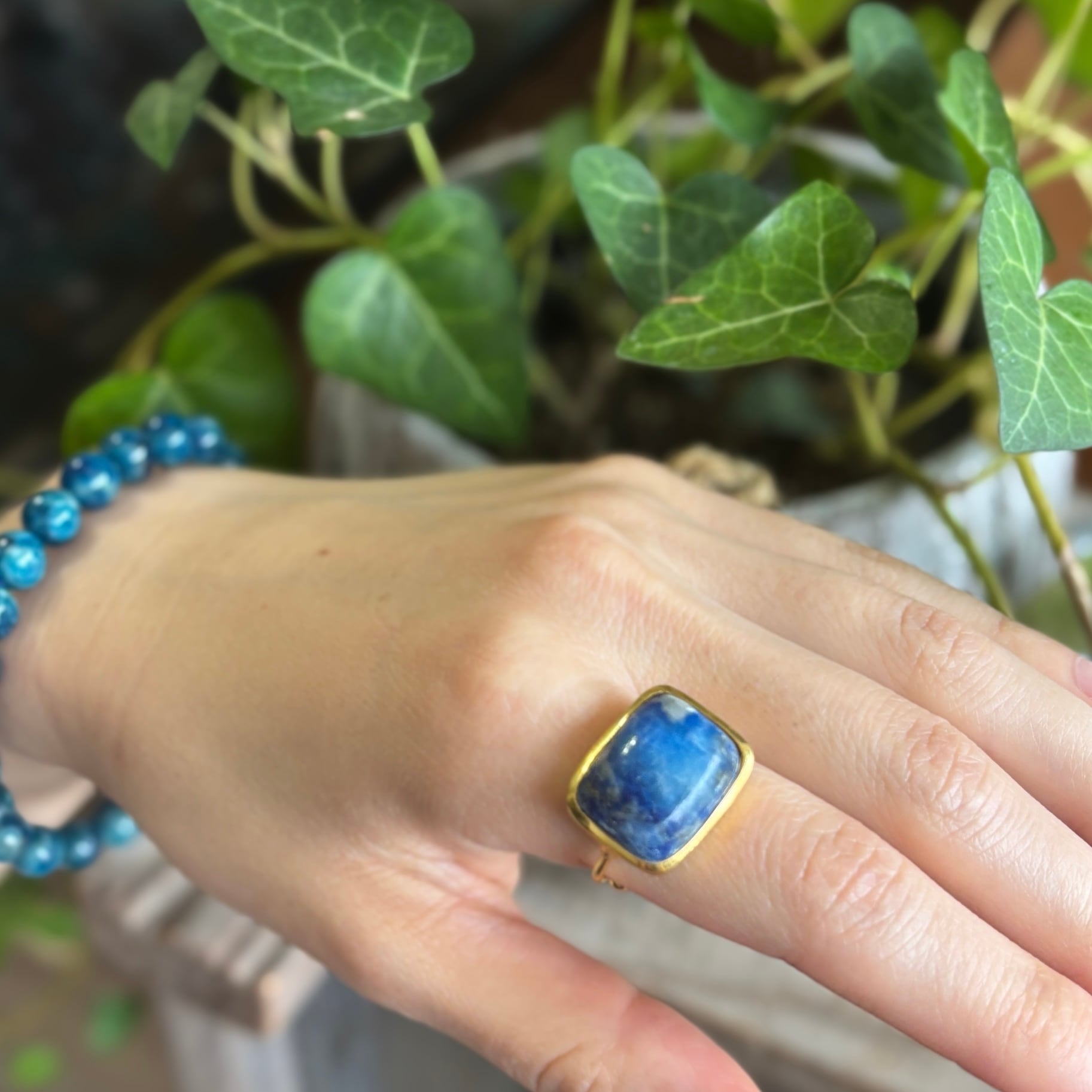 まるで地球のような、青がきれいなアフガナイト。身に着けることで大地とのつながりを感じさせてくれます。リングは手に馴染むデザインで、どんなシーンでもお使いいただけます。ブラックライトに照らされると、普段は見えない魅力的な蛍光が現れ、その美しさであなたの指先を引き立ててくれます。