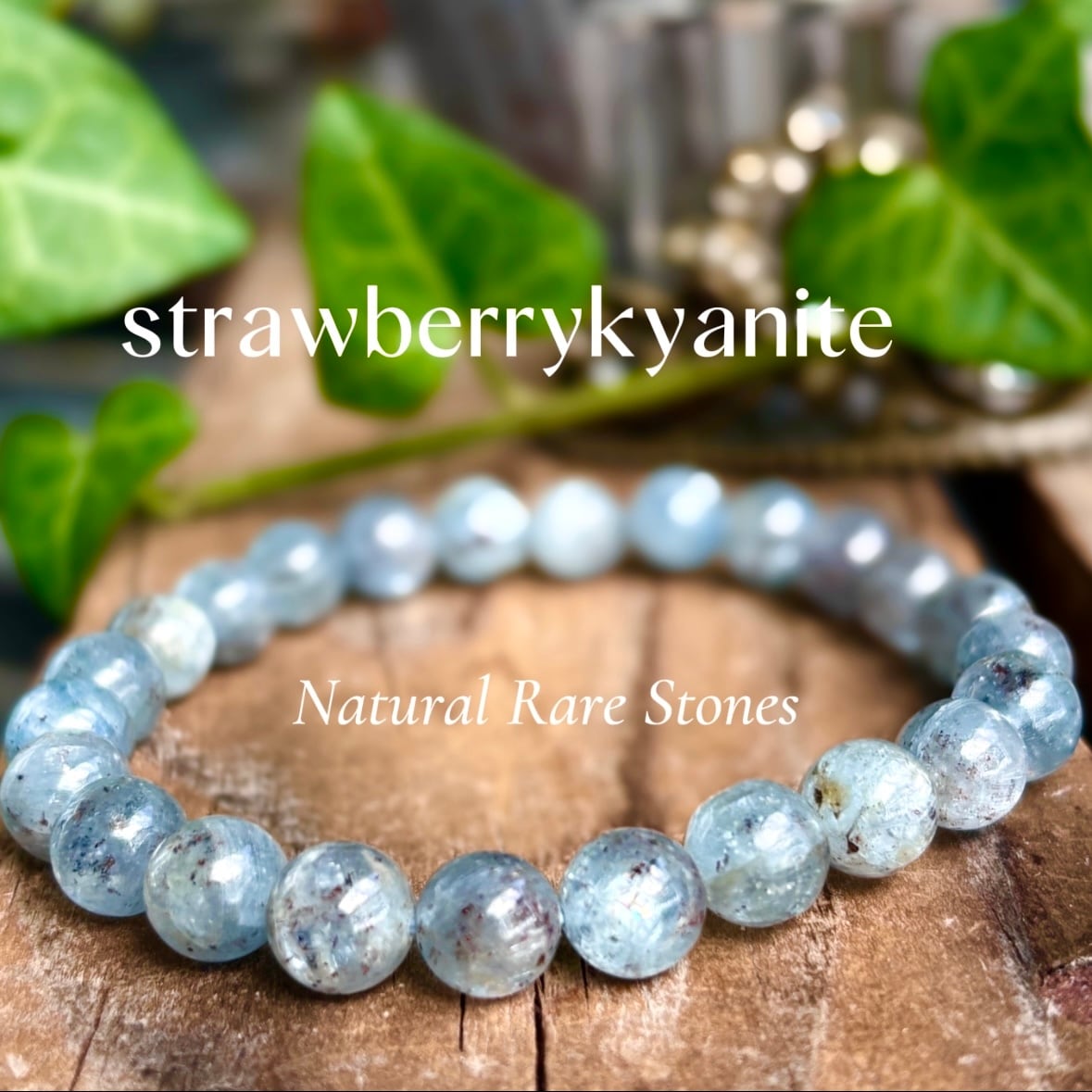 心を彩る魅惑の輝き、ブルーのシラーと苺を連想させる可愛らしいゲーサイト、レピドクロサイトの内包物が魅力のレアな石、ストロベリーカイヤナイトブレスレットです!