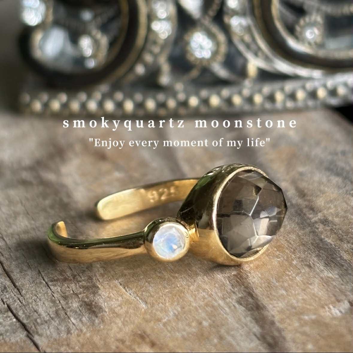 心を奪う大人可愛い輝き、12月の誕生石スモーキークォーツと6月の誕生石ムーンストーンを使用した素敵なリングです。