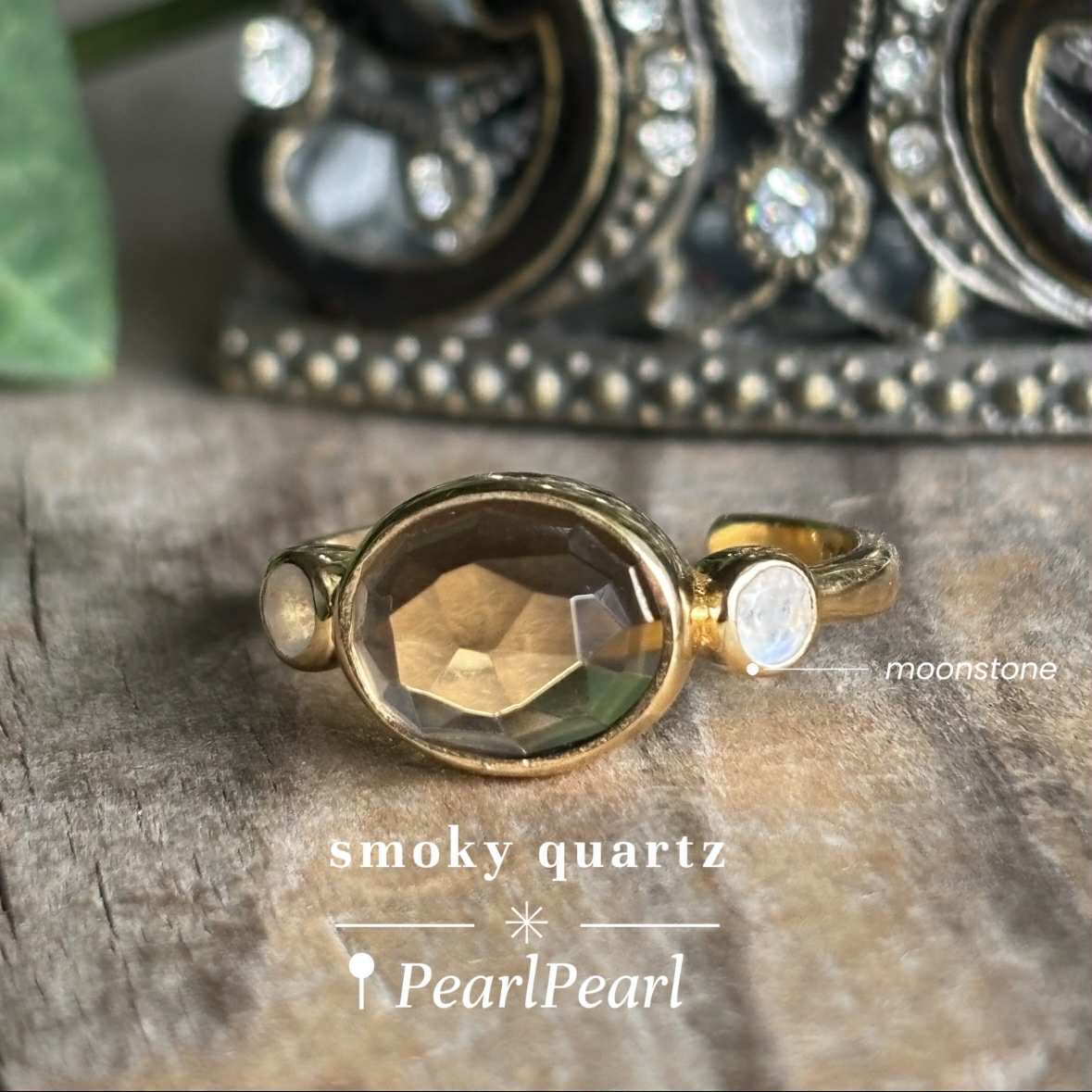 スモーキークォーツの深みある大人な色合いと、ムーンストーンの小さいながらブルーに光る二つの石の絶妙な組み合わせが、大人の女性にぴったりの洗練されたデザインとなっています。普段使いはもちろん、特別なシーンにも華やかさを添えてくれることでしょう。このリングを身に着けることで、自分らしさを引き立てる特別なアイテムになること間違いありません。