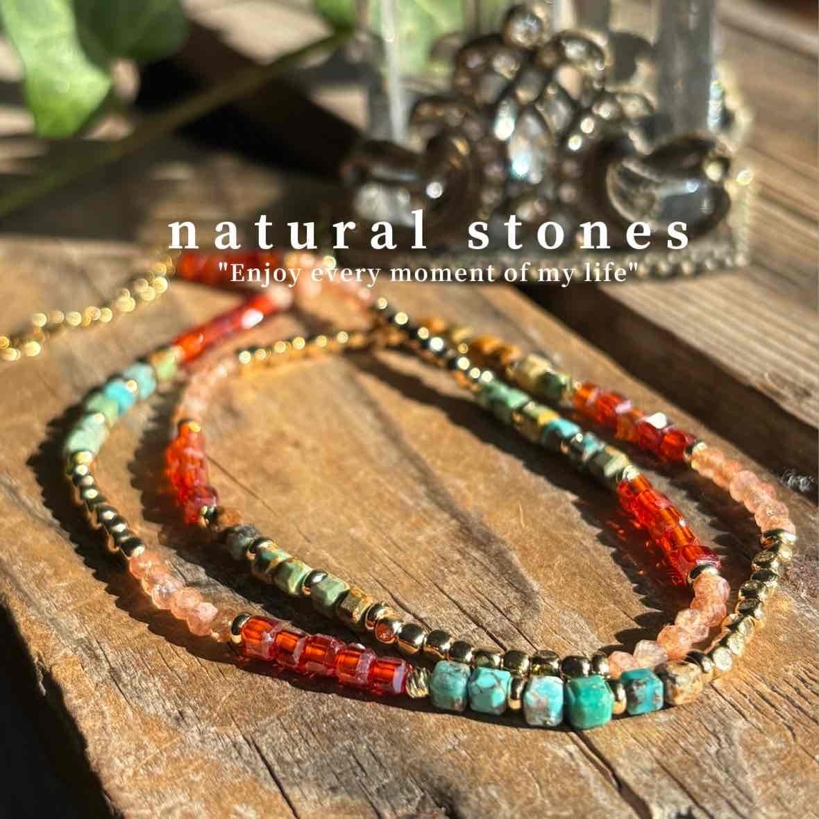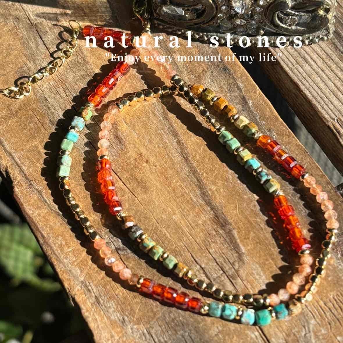 心を彩るカラフルな輝き、12月の誕生石ターコイズとジルコン、GOLDカラーのヘマタイト、サンストーンを使用したネックレスです!