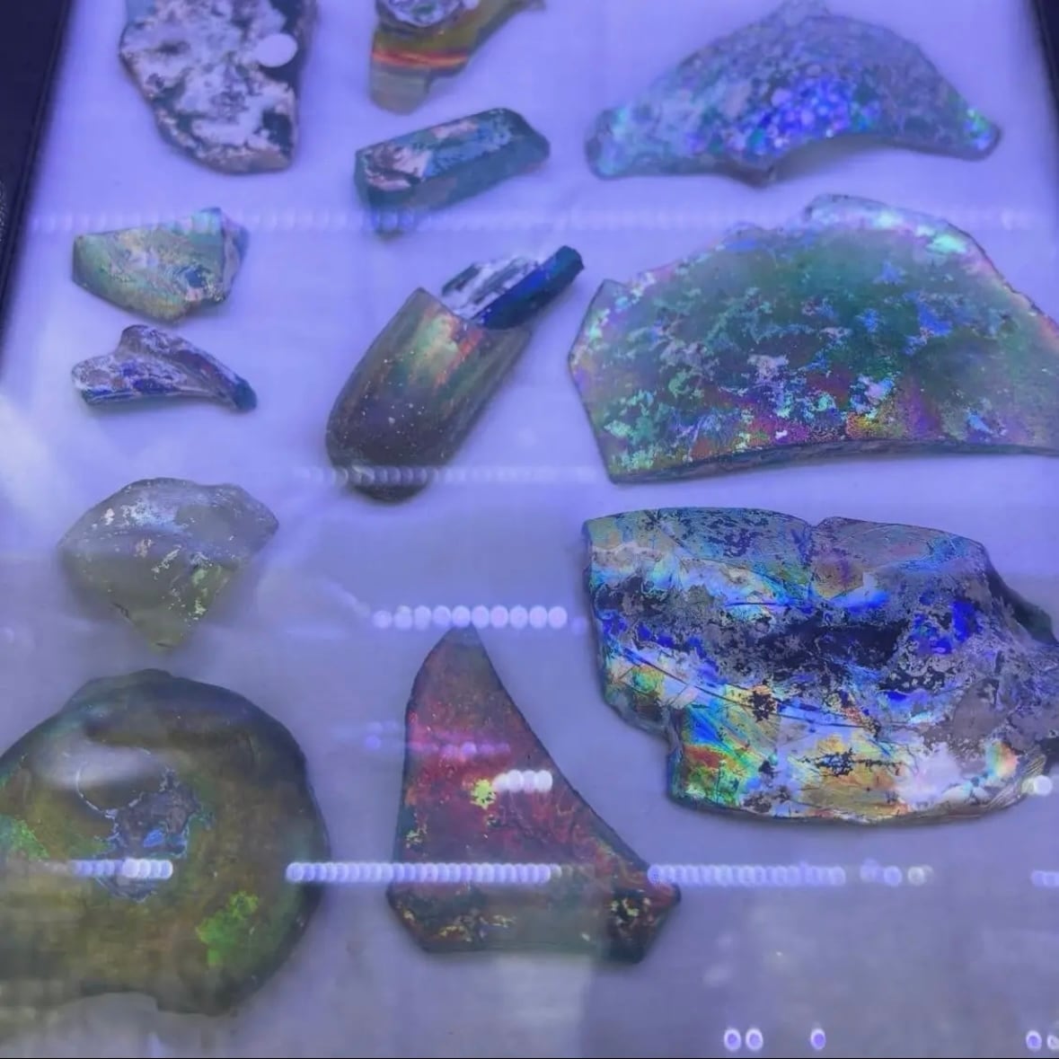 長い年月地中に埋まっていることにより、ガラスの成分が地中に含まれる鉄や銅,マグネシクムと化学反応を起こすことで薄い膜状のガラス膜を作り出す現象を指します。