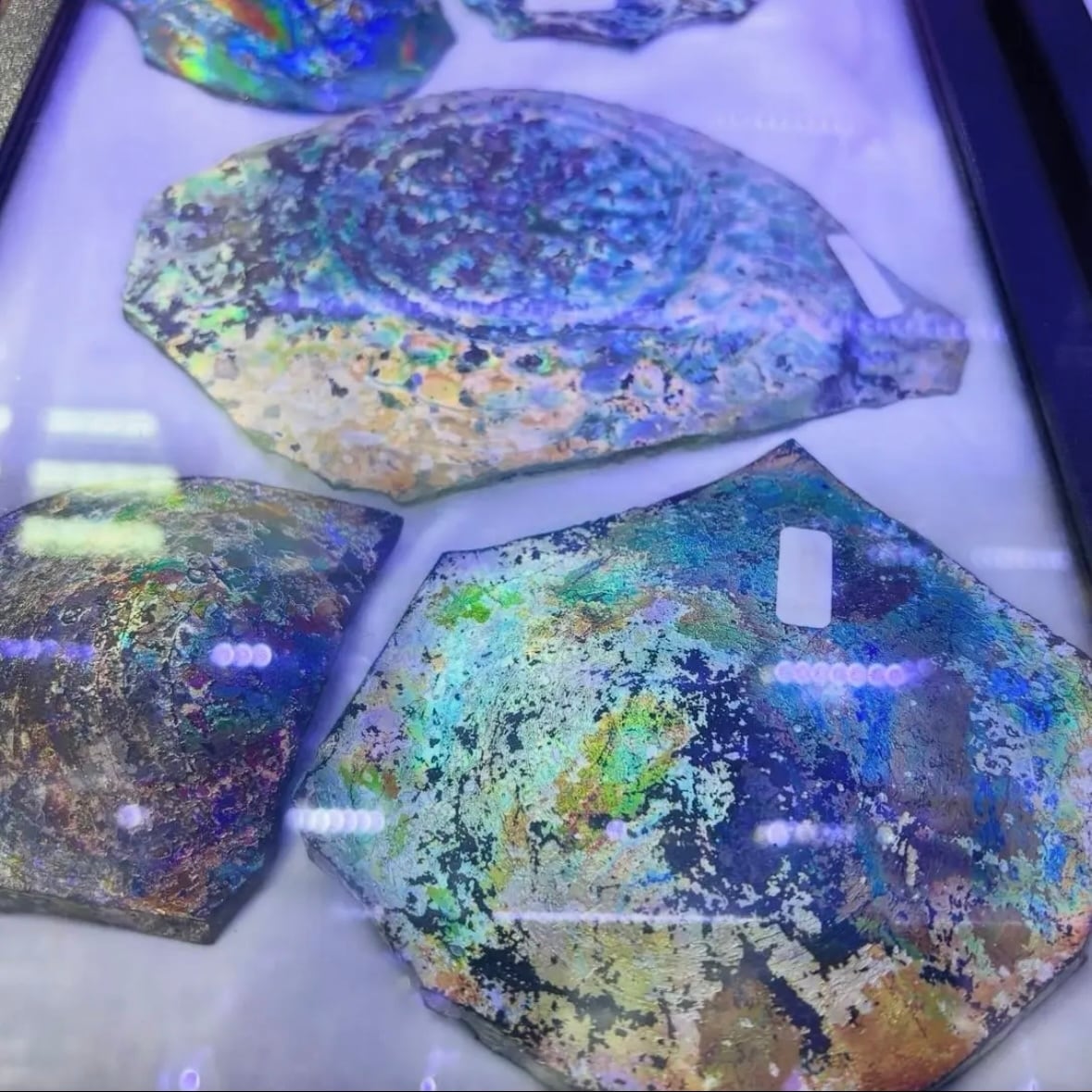 この銀化したローマングラスは、光の当たり加減によって様々な色合いに変化し、その美しさは決して人工的には再現できない、神秘的なものさえ感じられ、特にヨーロッパ諸国では宝石に並ぶ人気を博しています。