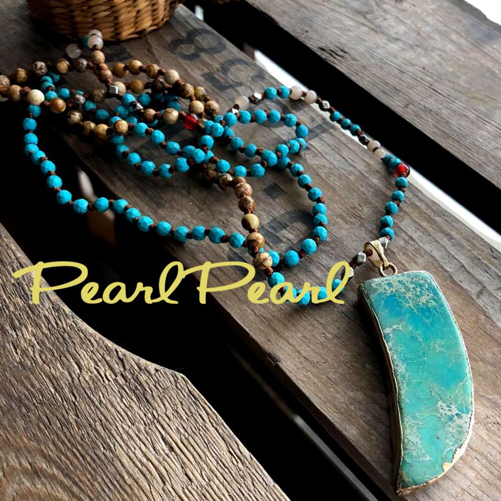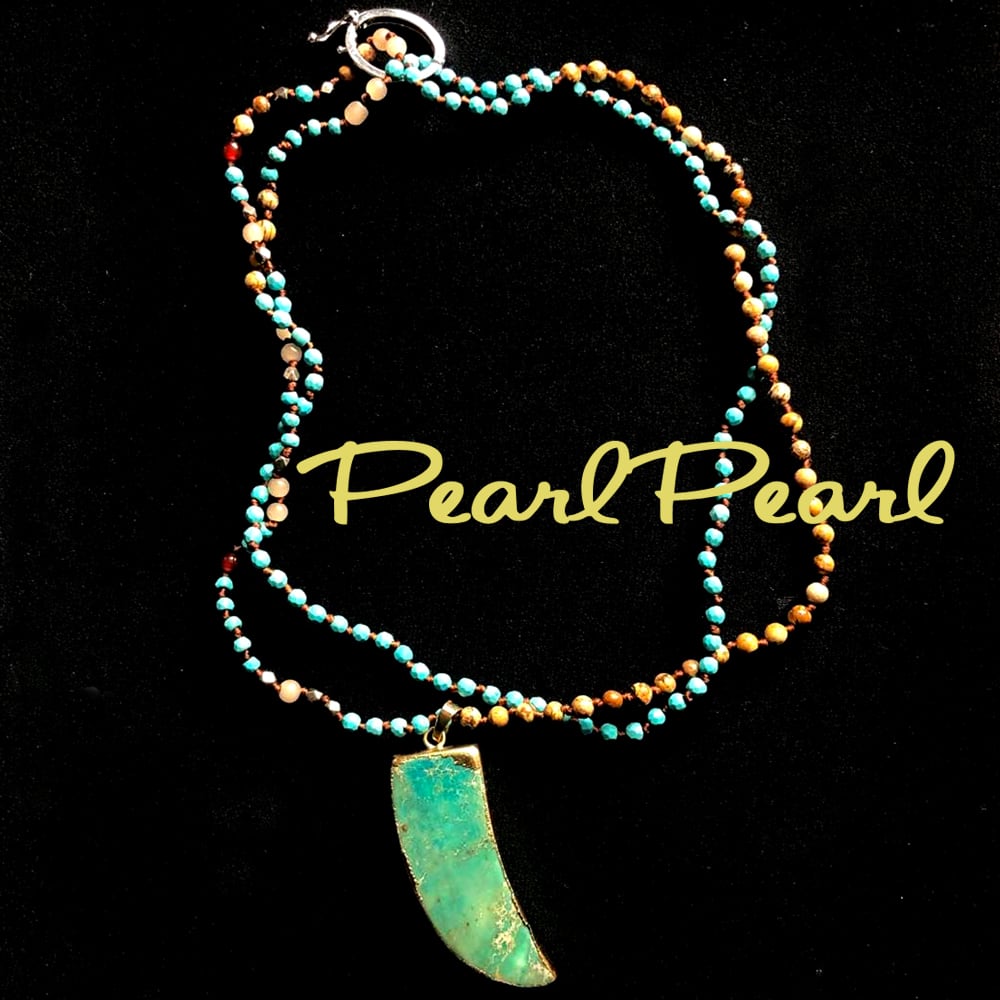 ピクチャージャスパーは独特の模様が特徴で、他の石とは一線を画す個性を引き立てます。合わせて瑪瑙、ヘマタイト、ターコイズビーズ粒を豪華に使ったオールノット加工のチェーンもとても可愛いくTOPを取り外して別のものと合わせても素敵です。