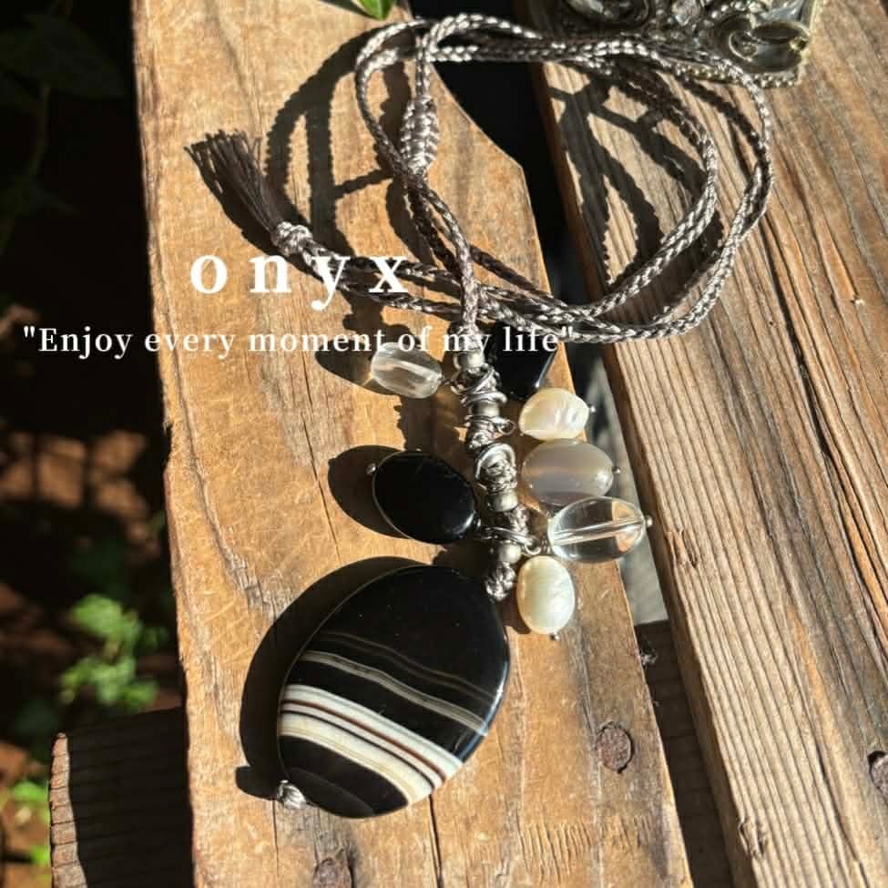 オニキスの深い黒色が独特の縞模様と相まって、神秘的でありながらも、エレガントな印象を与えます。デザインはシンプルですが、存在感があり、どんなコーディネートにも適していて、特別なシーンにもフィットします。このネックレスを着けることで、あなたの魅力を引き立てる特別なアイテムになること間違いありません。