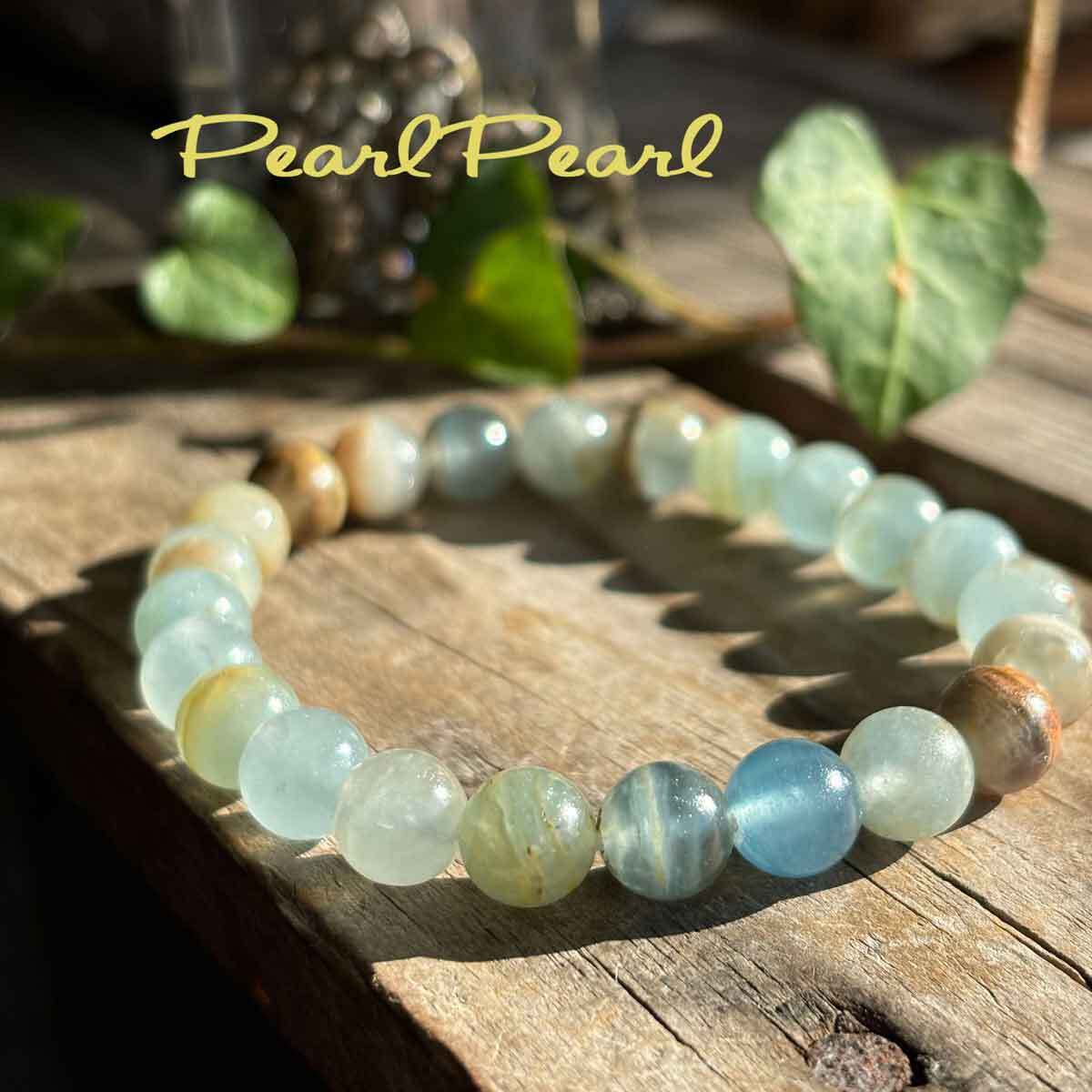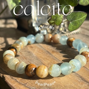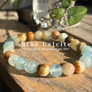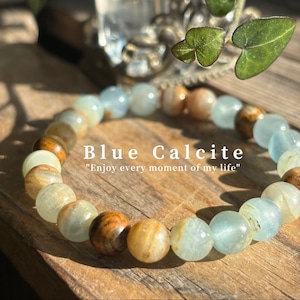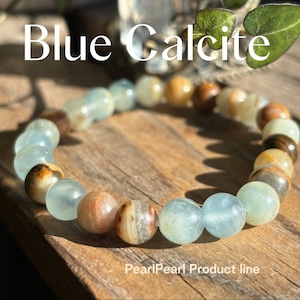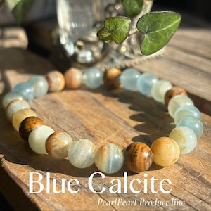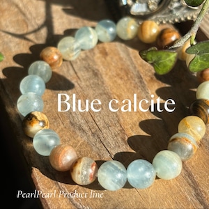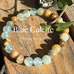 自然の美しさを感じさせる、ナチュラルカラーが特徴のブルーカルサイトブレスレット。独特の石模様が魅力的で、シンプルながらも存在感があります。