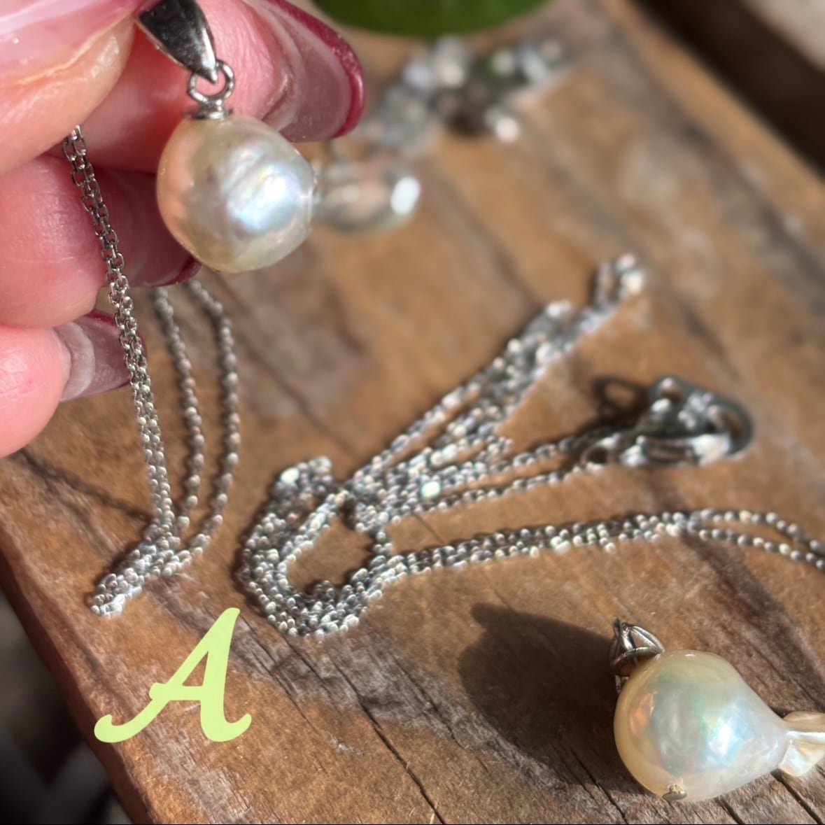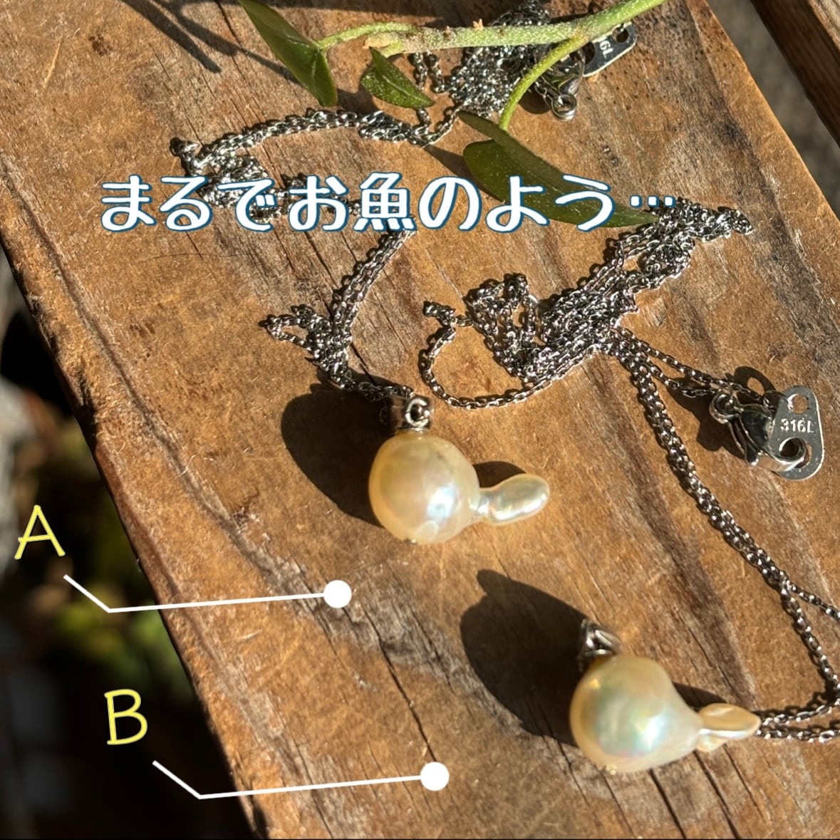 このネックレスは、バロック真珠の不規則な形状がまるで金魚やお魚…おたまじゃくしの尾っぽのような表情で、自然に出来たとは思えない個性的な真珠の形が特長です。